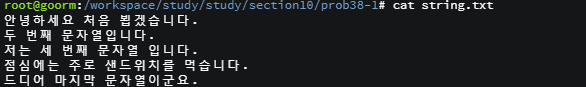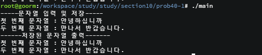 소스파일에서 설명했듯이 리눅스에서 한글은 2~3바이트로 불규칙 적이다. 실행화면을 보면 2개의 문자를 요청했으며 하나는 정상적으로 출력이 완료되었지만 다른 하나는 비정상적인 출력이 되는것을 알 수 있다.이것은 출력하려는 데이터의 크기가 정확하지 않아서 발생하는 문제이다.