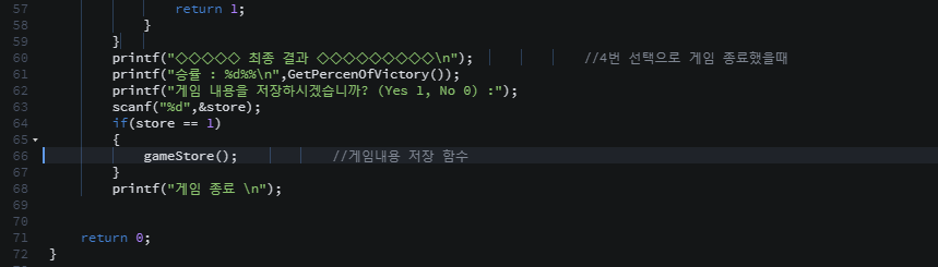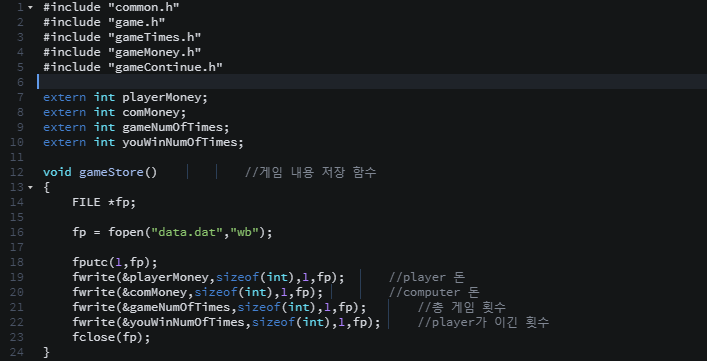 게임 저장할 함수들 사용을 편하게 하기 위해서 다른 파일에 존재하는 저장할 변수들을 extern을 이용하여 불러왔다. 파일을 저장할떄 1을 먼저넣음으로써 내용이 저장되어있음을 알리고 파일을 삭제하는 것 대신 저장한내용들을 없애는것을 표기하기 위해 저장할때 숫자 0을 먼저 넣어주었다..