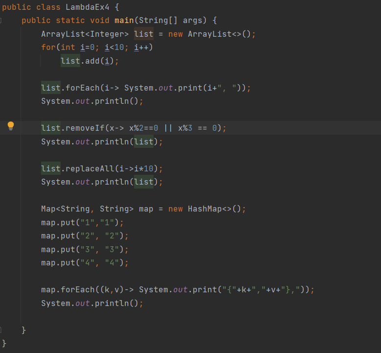 forEach()의 경우 스트림에 정의된 메서드로 매개변수에 대입된 람다식을 데이터 소스의 모든 요소에 적용시켜주는 메서드이다.