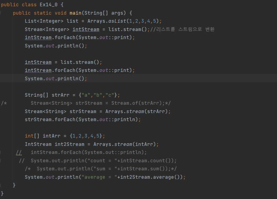 forEach()는 매개변수로 들어온 람다식의 작업을 스트림의 모든요소에 대해 수행한다.