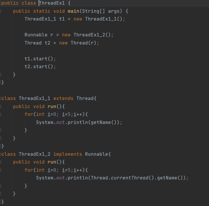 ThreadEx1_1의 경우 Thread클래스를 상속받아 쓰레드를 구현한 방식이고 ThreadEx1_2의 경우 Runnable인터페이스를 상속받아 인스턴스를 구현한 후 Thread클래스의 생성자의 매개변수로 Thread를 구현한 방식이다.