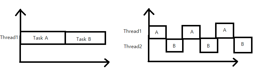 왼쪽의 그림의경우 싱글스레드로 두개의 작업을 한경우이고 오른쪽의 경우 두개의 쓰레드로 두개의 작업을 한경우이다.