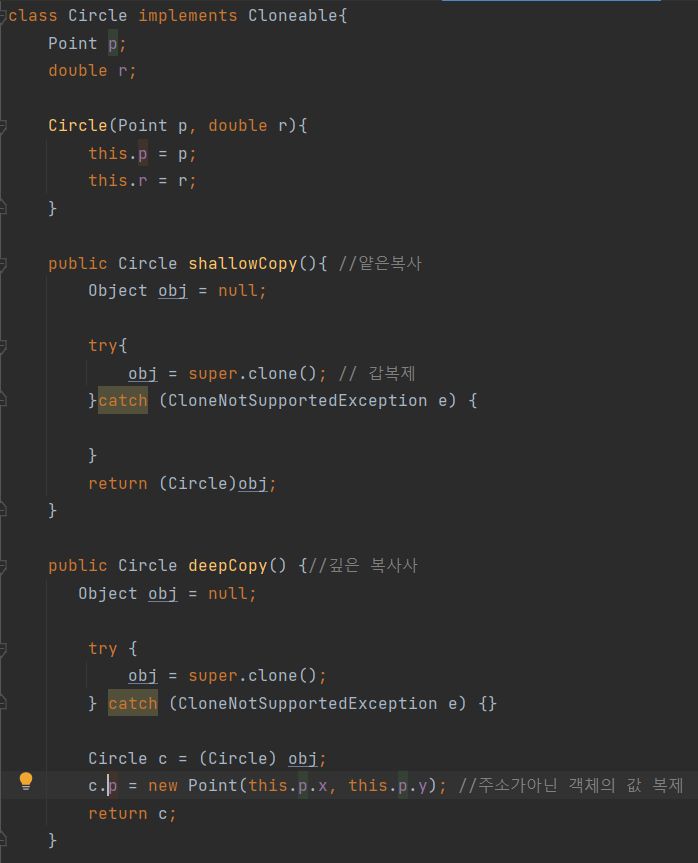 또한 clone()메서드를 호출할때는 반드시 예외처리를 해주어야한다.