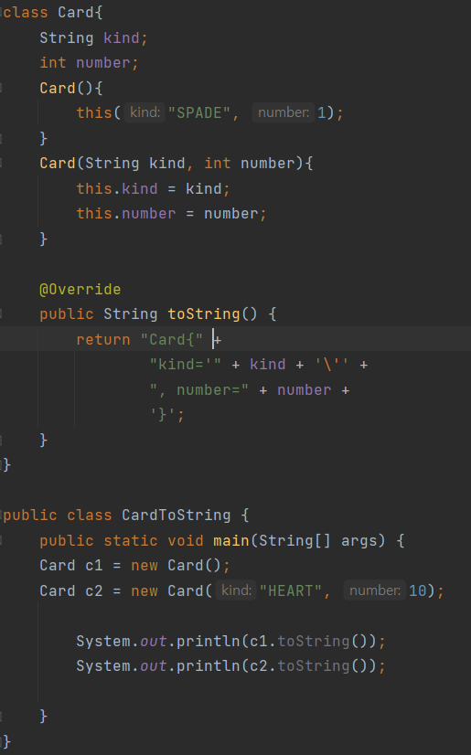 하지만 위의 정보들은 사용시 유용하지 않기 때문에 toString()메서드는 일반적으로 인스턴스 클래스에 대한 정보나 인스턴스 변수들의 값을 문자열로 반환하도록 오버라이딩하여 사용된다.