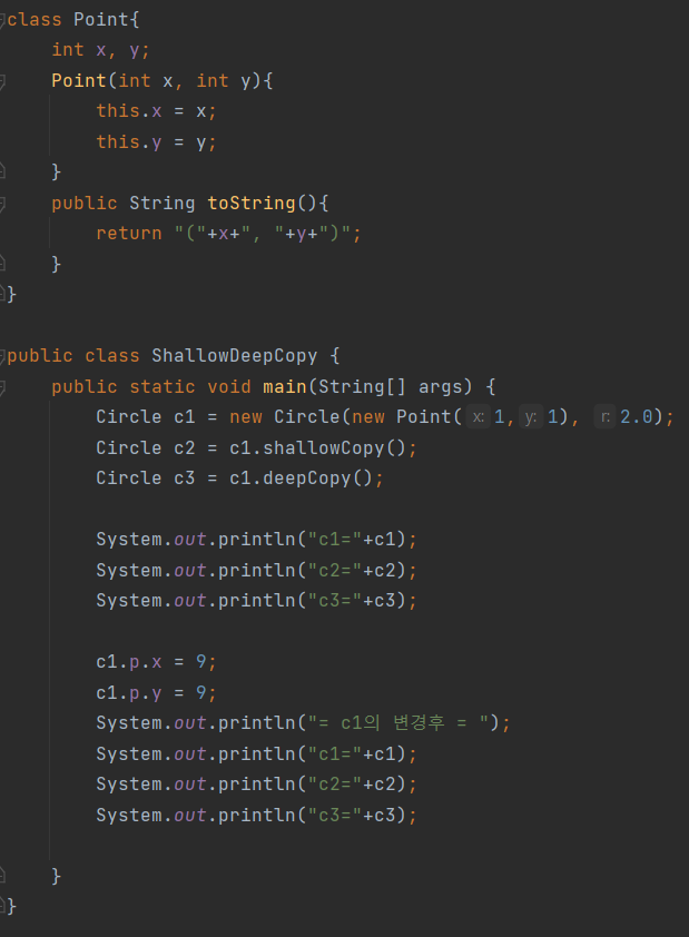 그러나 위처럼 깊은복사를 clone메소드를 통해 구현하고싶다면 참조변수의 객체를 복제가 가능하도록 깊은복사 메서드를 구현 해주어야한다.