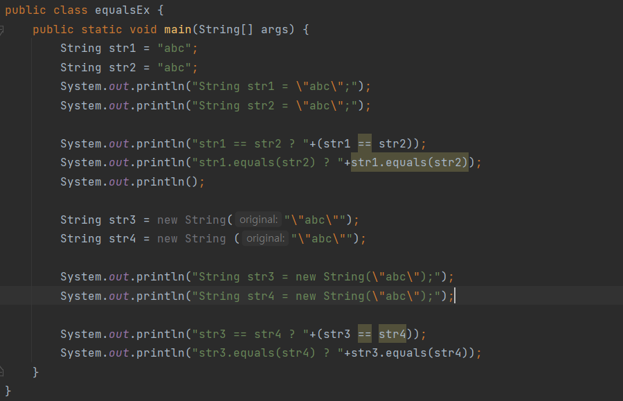 String 클래스에 저장된 문자열 비교시에도 ==이 아닌 equals 메소드를 사용한다.