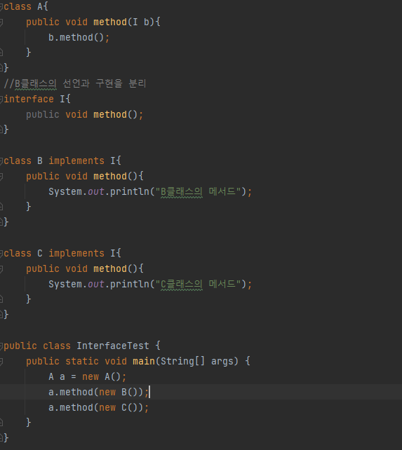 A클래스 코드의 변경없이도 B또는 C 클래스 즉 method 메소드의 구현부를 수정함으로써 코드변경을 최소화 하였다.