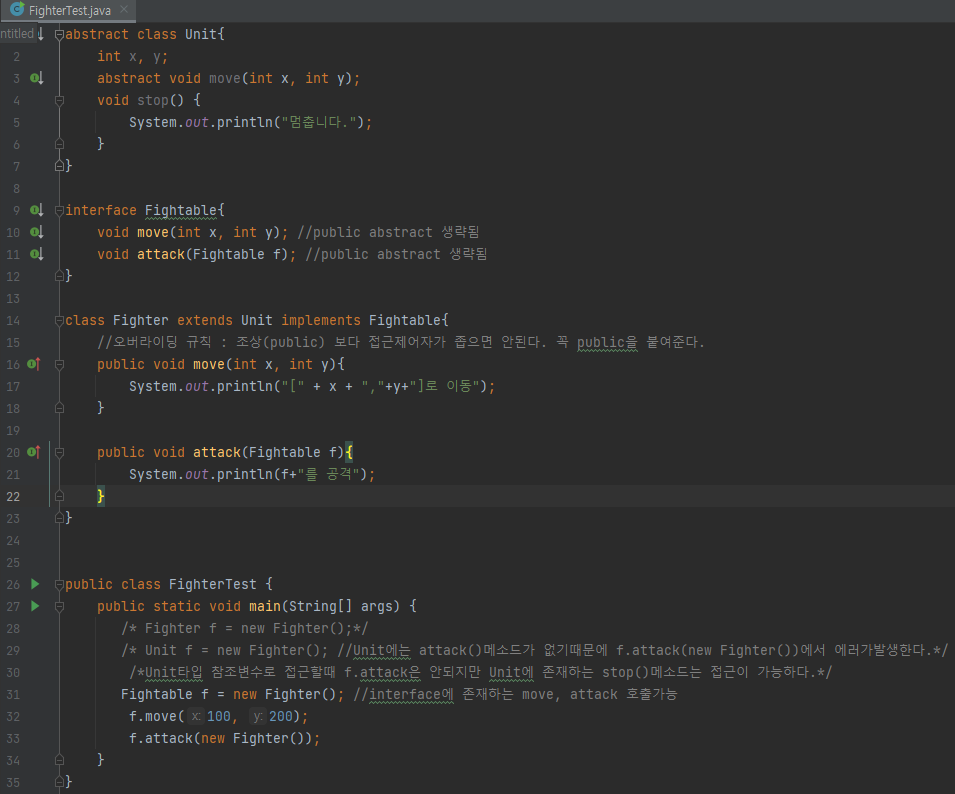위의 경우 attack메서드에서 Fightable 인터페이스 타입이 매개변수로 지정되어 있다. 그렇다면 해당 메서드를 호출할때는 Fighter 인스턴스 객체를 매개변수로 넣어주어야한다.