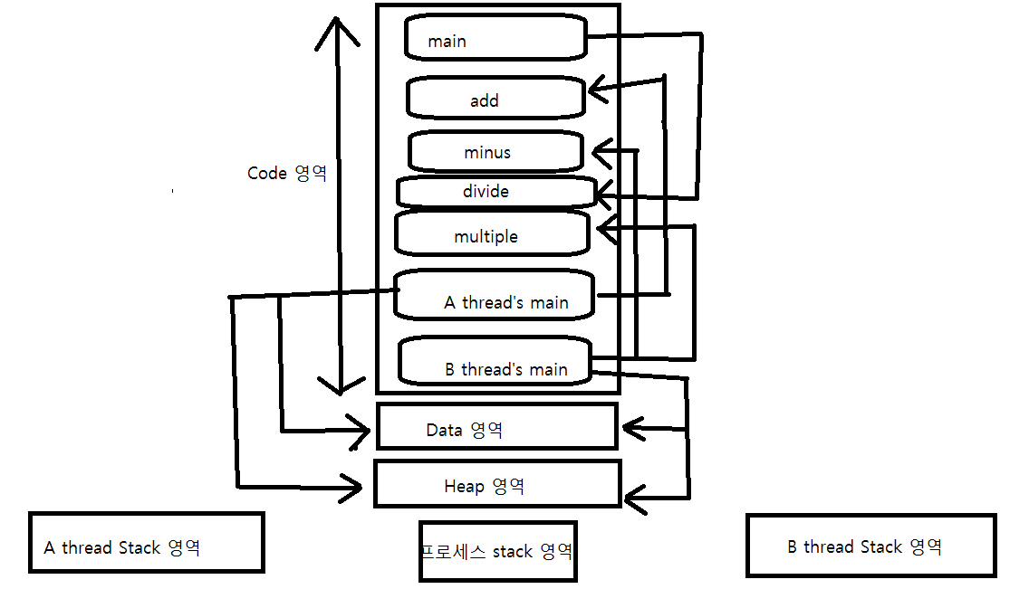 쓰레드는 메모리를 공유한다. 특히 전역변수가 할당되는 데이터 영역과, 메모리가 동적으로 할당되는 힙영역을 공유한다.