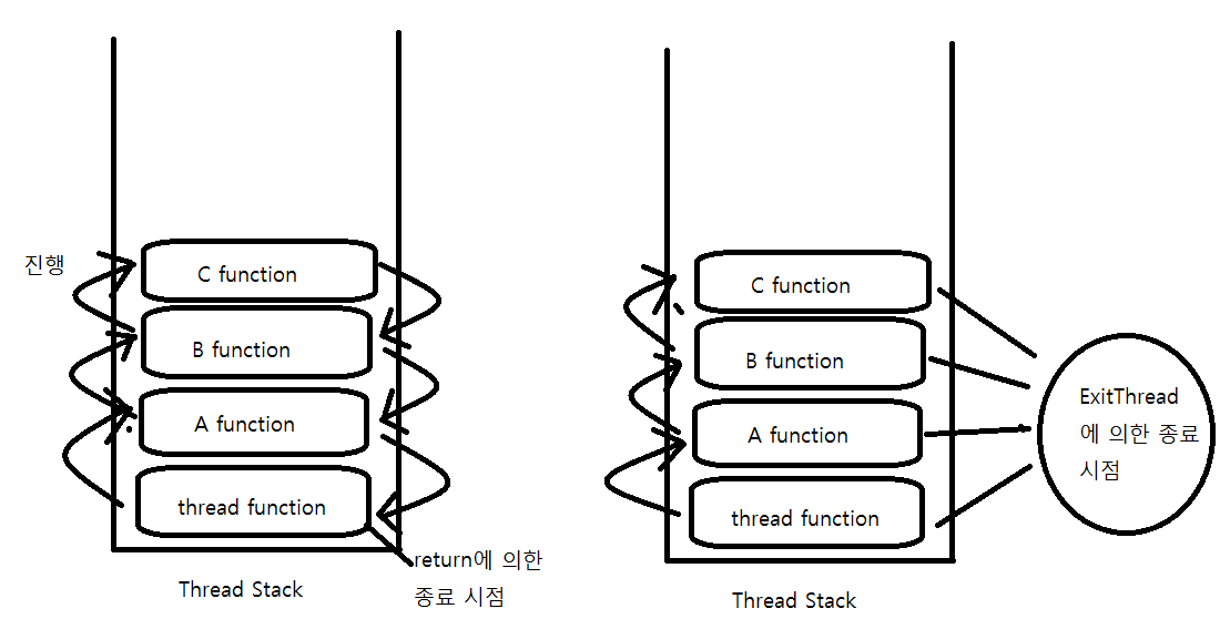 ExitThread 함수를 활용해야할 상황이라면 _endthreadex(unsigned retval);를 사용하는 것이 좋다. _endthreadex이 함수는 내부적으로 쓰레드에 할당된 메모리를 해제하고 ExitThread함수를 호출한다. 쓰레드 함수에서 return 문을 이용하더라도 _endthreadex함수가 자동으로 호출된다.