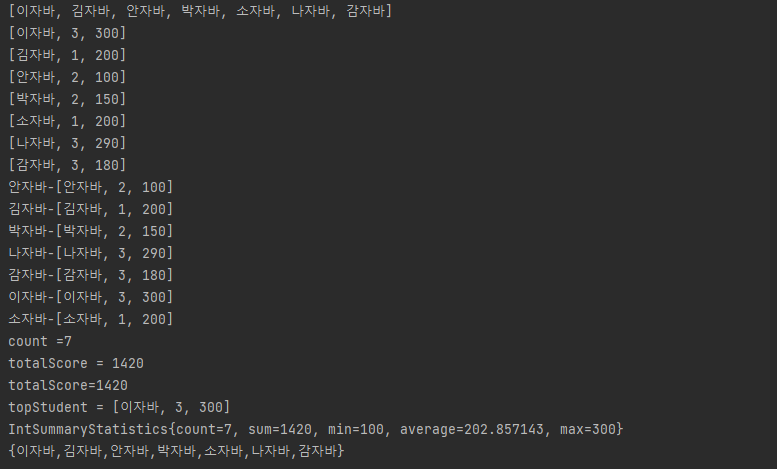 IntSummaryStatics stat = stuStream.mapToInt(Student::getTotalScore).summaryStatistics();