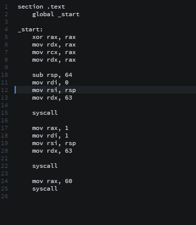 rax, 0 sys_call number 0번은 sys_read이다. 파일을 읽어들이는 함수인다. rdi 0을 통해 fd를 0으로 설정해주어 stdin이 가능하다. 즉 키보드 입력이 가능한 것이다. 이후 rsi에는 저장될 공간 rsp를 넣어주고 rdx에는 저장가능한 문자열 공간 63을 넣어준다. 64를 확장해주고 NULL이 들어갈 공간을 위해 rdx에는 63을 넣어준 것이다.