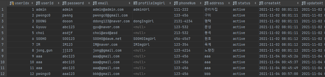 userRes에서 Select query문을 통해 데이터를 가져오는것같다. 받은 데이터를 GetUserRes의 각 getInt, getString을 통해 각각 데이터를 넣어준다. BaeMin.user 테이블의 모든 데이터를 가져와서 GetUserRes 오브젝트에 저장하고 해당 결과를 return해준다.