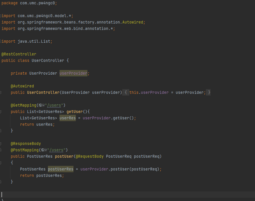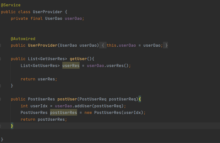 Provider에서 userDao의 각 메서드들을 호출한다. getUser는 userRes()를 호출하고 postUser는 addUser를 호출한다.